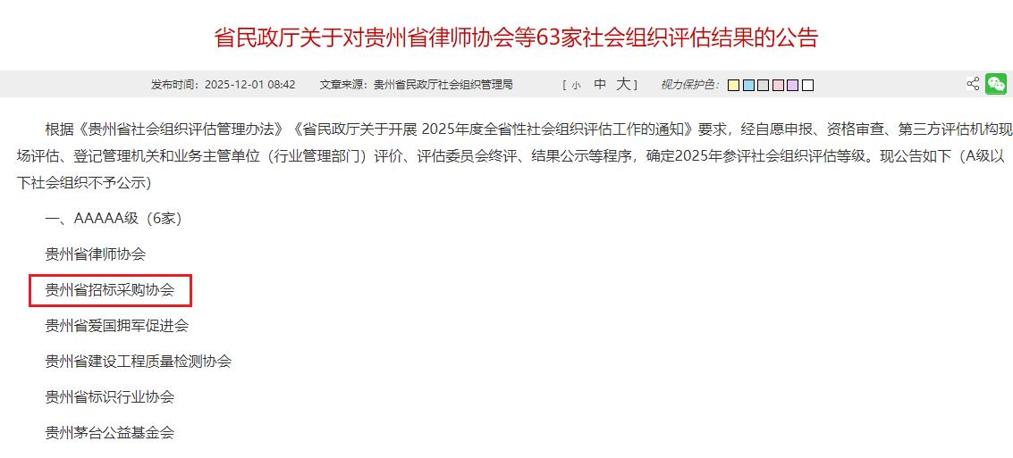 2025年12月1日,贵州省民政厅正式发布《关于对贵州省律师协会等63家社会组织评估结果的公告》。贵州省招标采购协会凭借规范的组织建设、内部治理、服务能力等方面,再次获评“5A级社会组织”荣誉称号,这份殊荣不仅是对协会多年来坚持党建引领、深耕行业发展、践行社会责任的权威认可,更是对未来的鼓励与期许。