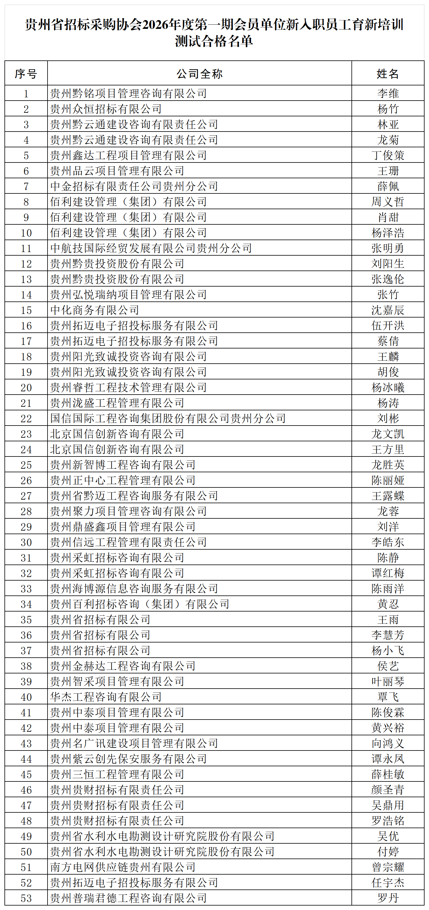附:贵州省招标采购协会2026年度第一期会员单位新入职员工育新培训测试合格名单
